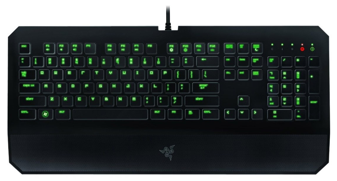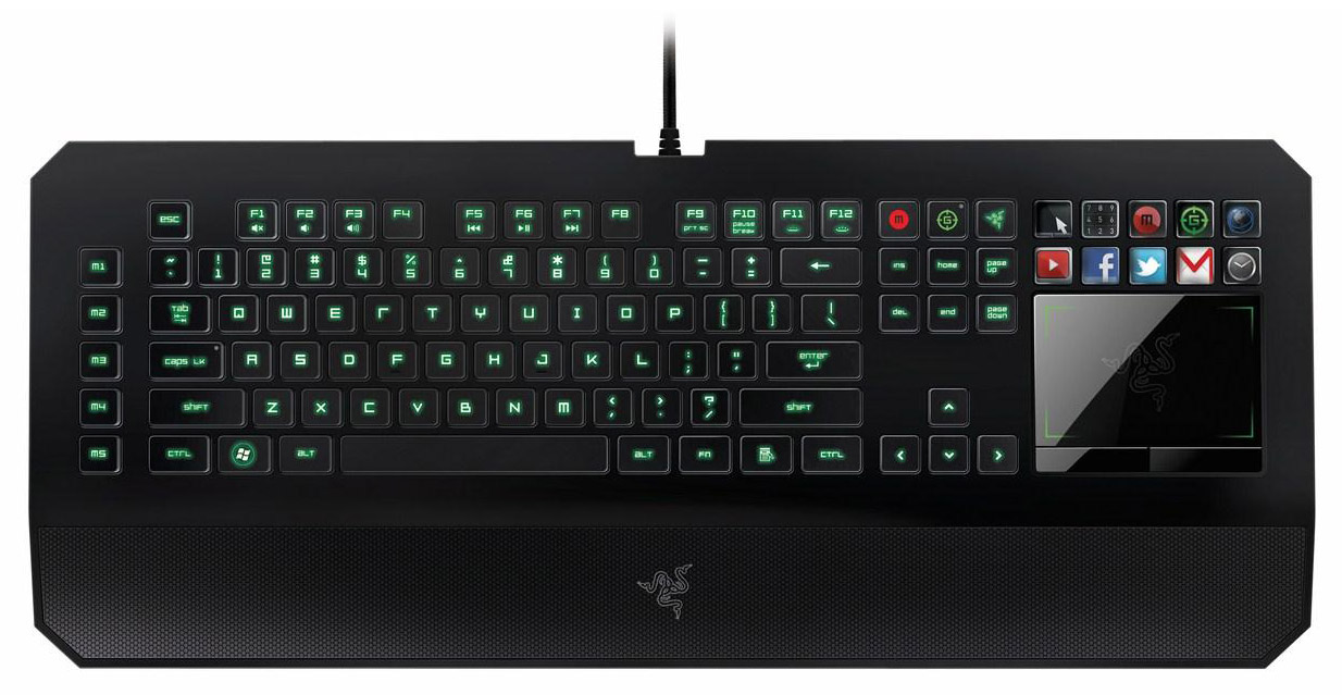 - Razer DeathStalker Ultimate — полноценная модель. Вместо цифрового блока клавиш, клавиатура оснащена 4,05 дюймовым сенсорным дисплеем с интерфейсом Switchblade UI и 10 программируемыми клавишами. Подсветка реализована в мульти режиме, а число одновременных нажатий равняется 10;