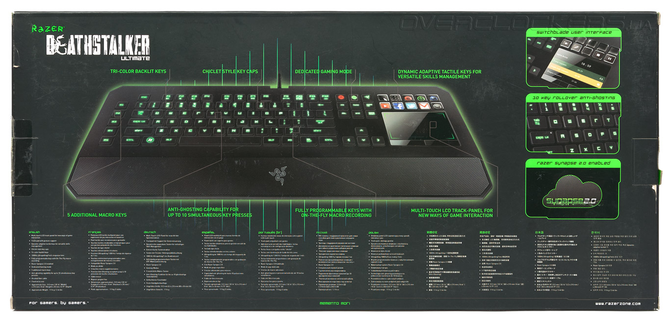 В нижнем правом углу кратко перечислены ключевые особенности: наличие пользовательского интерфейса Switchblade, одновременное нажатие 10 клавиш и, конечно же, поддержка фирменного ПО Synapse 2.0.