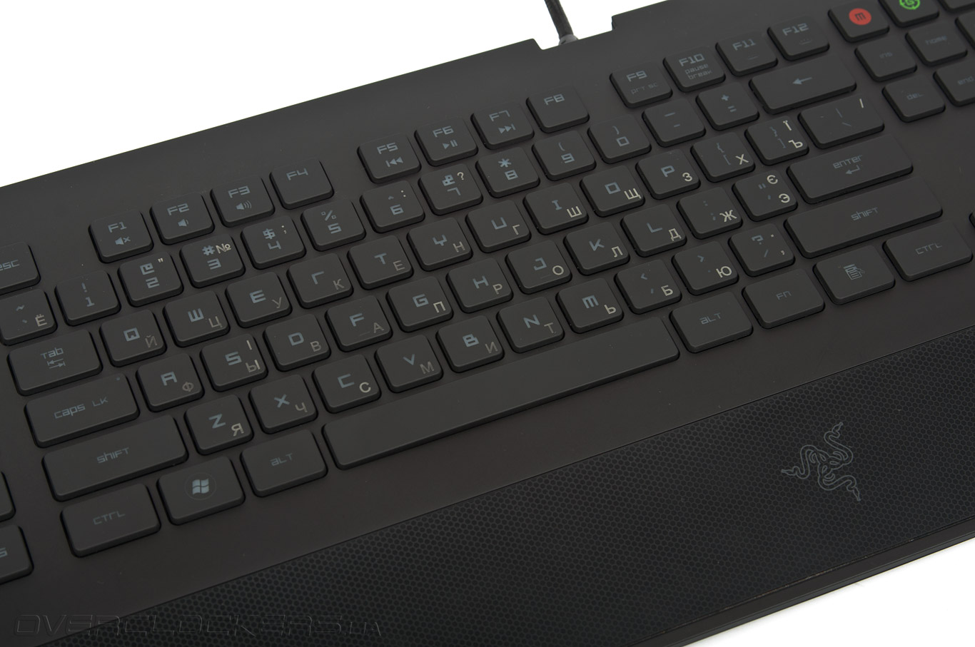 Стилистика латинских символов существенно отличается от традиционной. Все латинские символы нанесены фирменным шрифтом Razer, который вошел в активный обиход компании с момента выпуска первых моделей BlackWidow. Футуристические очертания литер со стороны выглядят действительно интересно и необычно, но вместе с тем применение нестандартного шрифта повлекло ряд трудностей, связанных с визуальным восприятием некоторых литер. Среди таковых выделим латинскую литеру «R», в точности напоминающую кириллическую букву «Г».