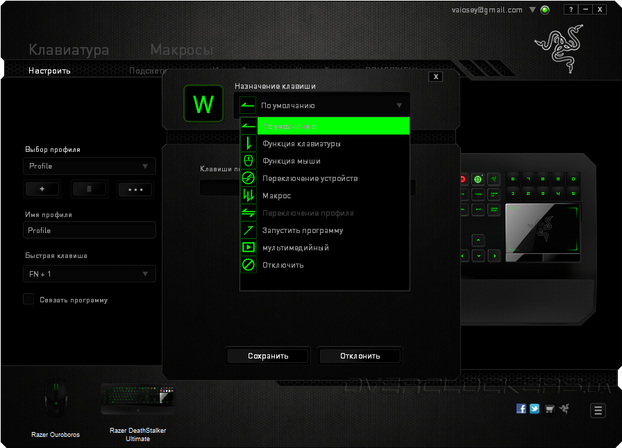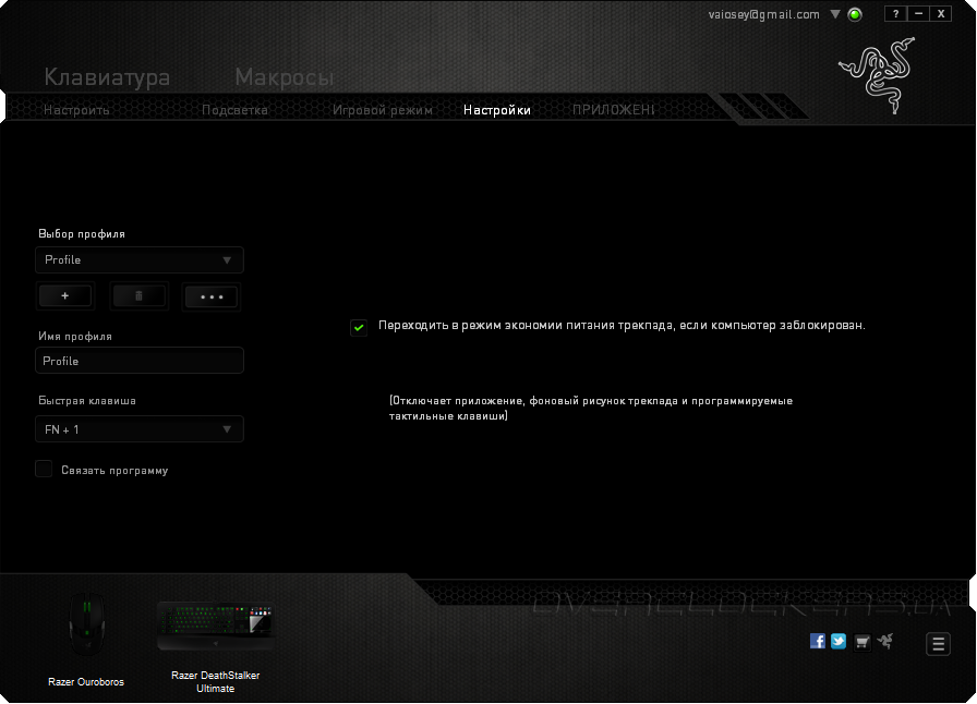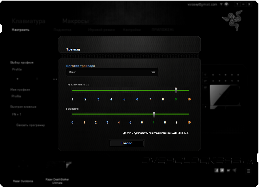 Вкладка «Настроить» позволяет настраивать профили устройства, назначения клавиш и параметры трекпада. Все изменения и корректировки сохраняются в текущем профиле. Всего можно создать до десяти различных пресетов и в дальнейшем использовать каждый из них по своему усмотрению.