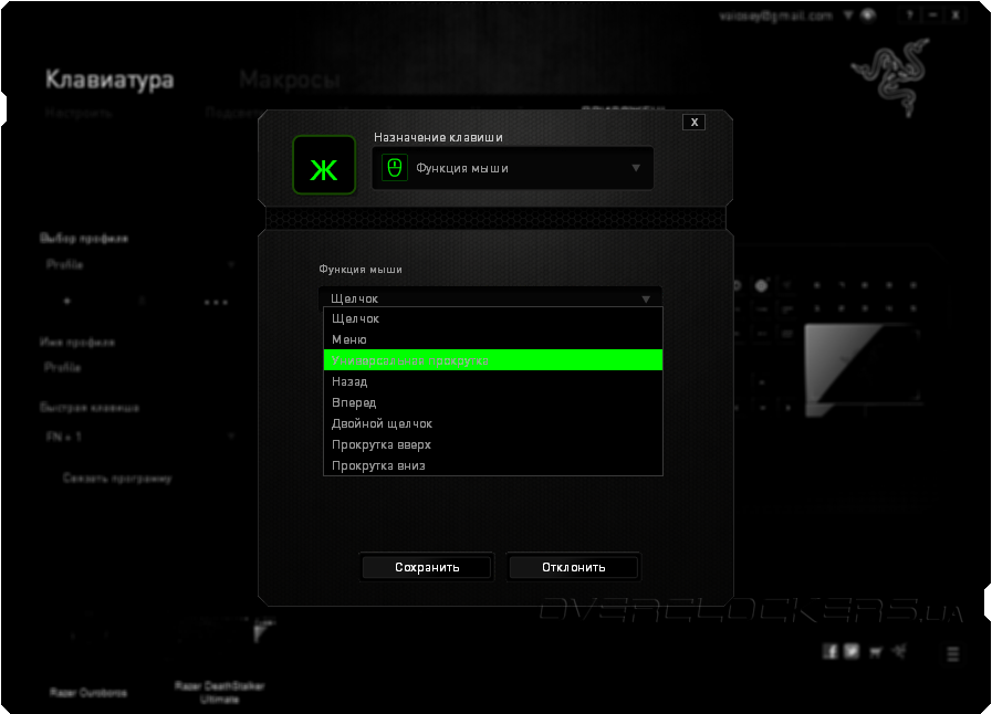 - Функция мыши — назначение любой кнопке функции мыши (клик левой/правой кнопкой, прокрутка вперед/назад и т.д.);