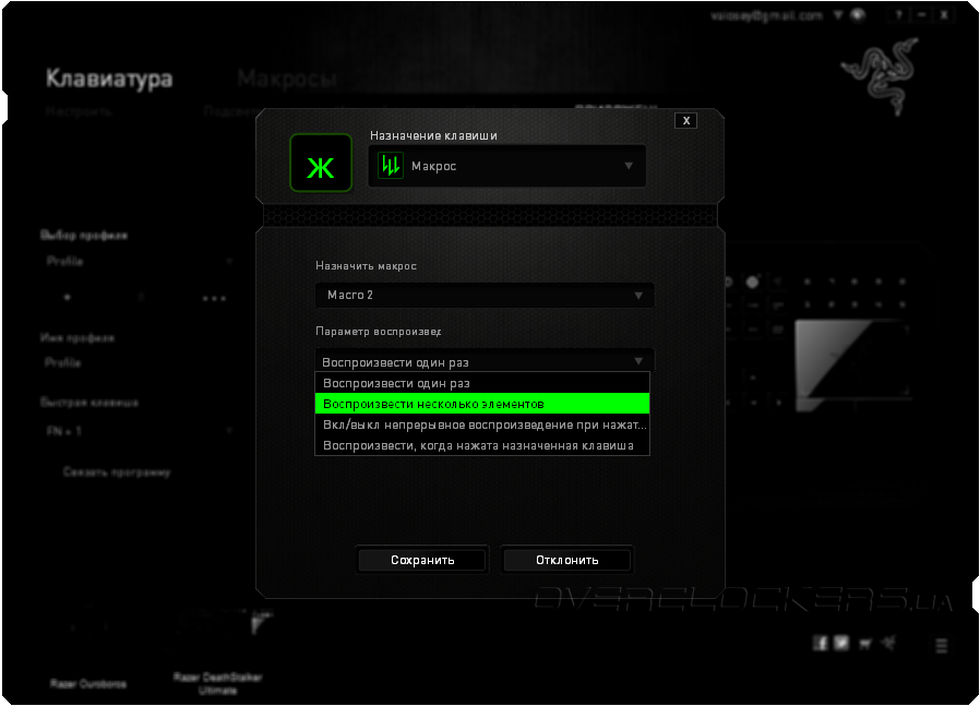 - Макрос — назначении ранее созданной макрокоманды к определенной клавише;