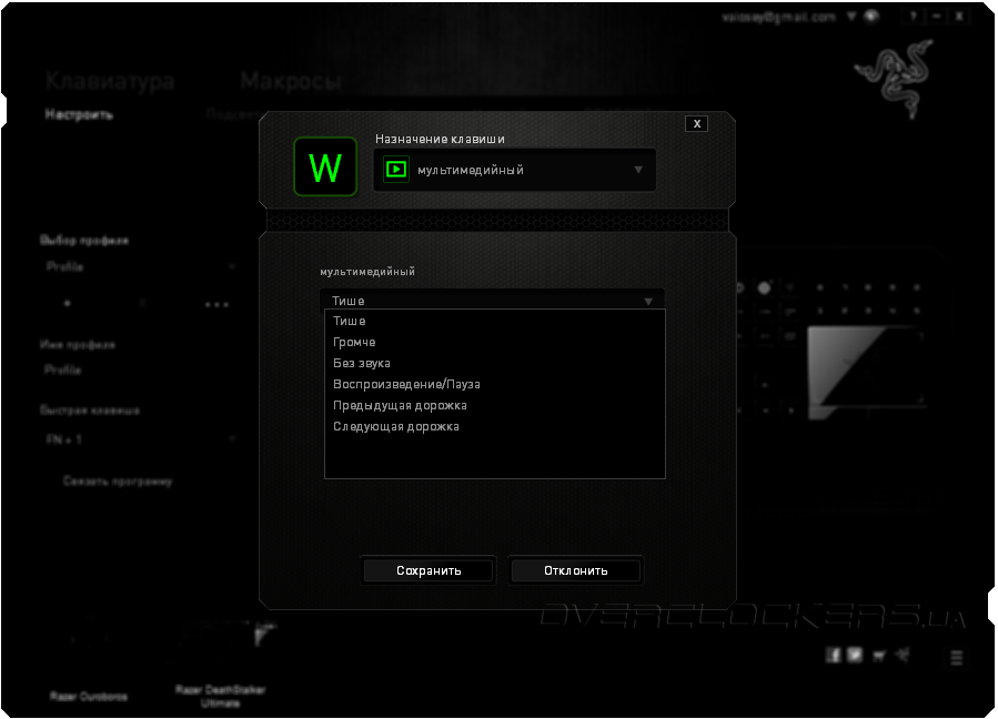 - Мультимедийный — этот параметр подвязывает мультимедийные функции к выбранной клавише (увеличение/уменьшение громкости, воспроизведение/пауза и т.д.);