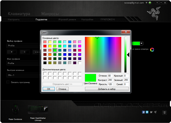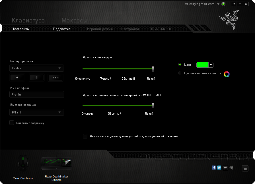 Во вкладке «Подсветка» меняется цвет, режим работы, яркость подсветки клавиш и пользовательского интерфейса Switchblade.