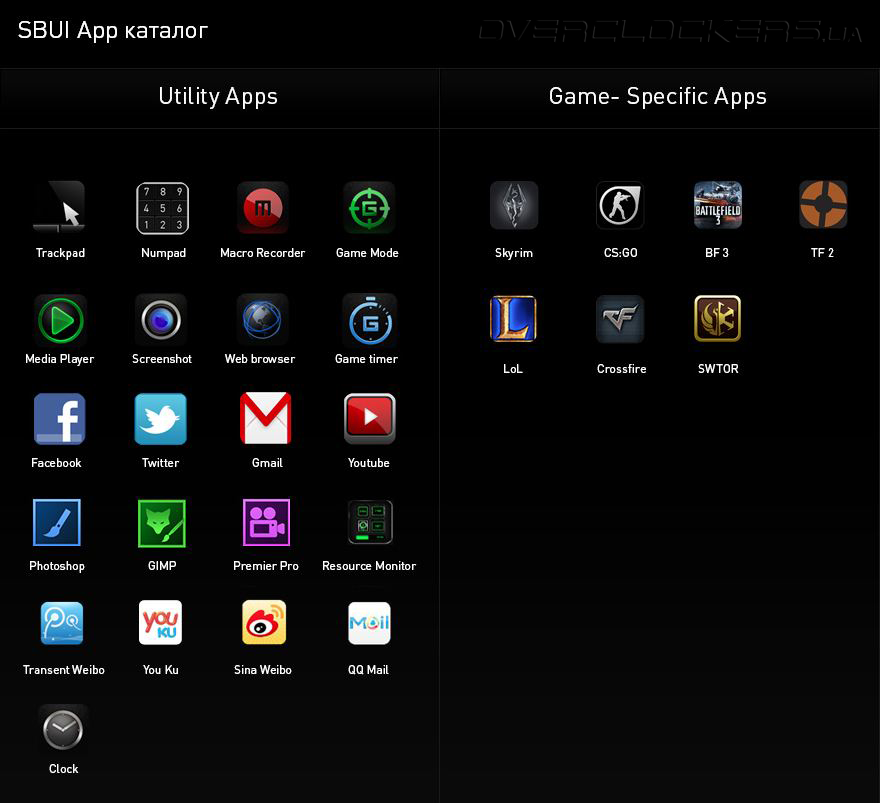 Среди доступных игровых приложений на момент тестирования были: Counter-Strike, Battlefield 3, Cross Fire, League of Legends, Skyrim, Star Wars: The Old Republic и Team Fortress 2. Активируя игровой трекпад, каждой из десяти тактильных клавиш задается определённая команда/действие игрового персонажа.