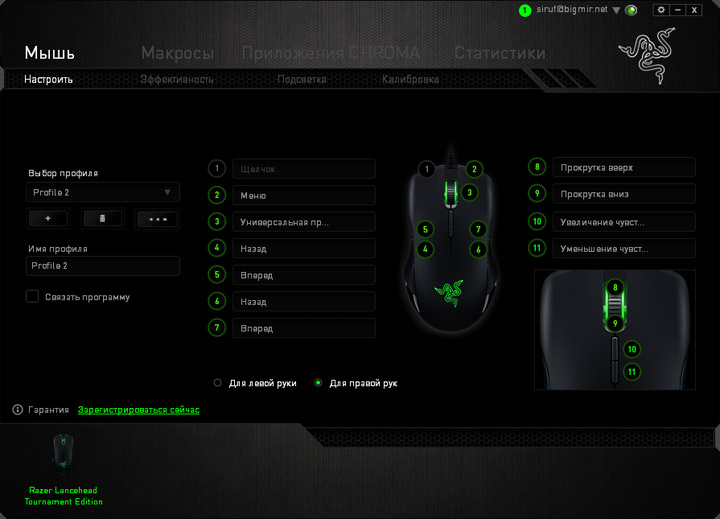 Экран настройки мыши позволяет переназначить команды на девяти кнопках и двух направлениях колеса прокрутки. На выбор есть стандартные команды мыши или клавиатуры, функции Windows приложений и макросы. Все настройки можно сохранить в индивидуальные профили, активация которых привязывается по необходимости к запуску тех или иных программ. Кроме того, можно переключить основные кнопки мыши для использования под левую или правую руку.
