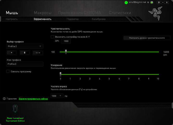В настройках «эффективности» регулируется разрешение сенсора в пределах от 100 до 16000 dpi с шагом в 100 dpi. Можно настроить пять отдельных уровней чувствительности, которые будут переключаться «на лету». Доступно раздельное или синхронное изменение чувствительности по осям X и Y. Позитивная акселерация курсора выставляется в рамках от 0 до 10 единиц. На выбор есть три частоты опроса — 125, 500 или 1000 Гц.