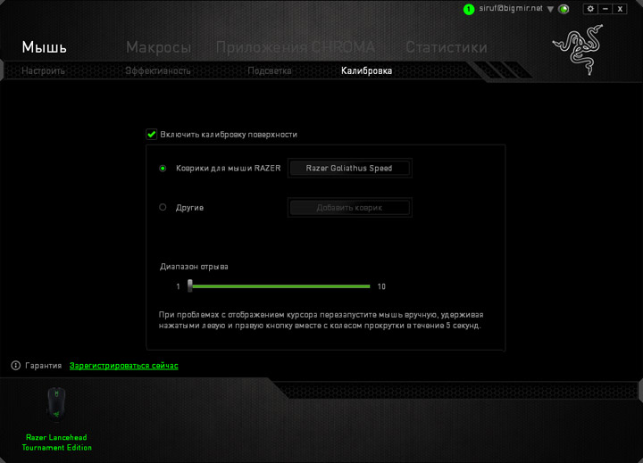 Калибровка позволяет настроить высоту отрыва сенсора от поверхности под конкретный тип коврика. Это можно сделать путем выбора фирменного коврика Razer из перечня с готовыми настройками, осуществить автоматическую калибровку под любой новый тип поверхности или задать высоту отрыва вручную.