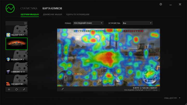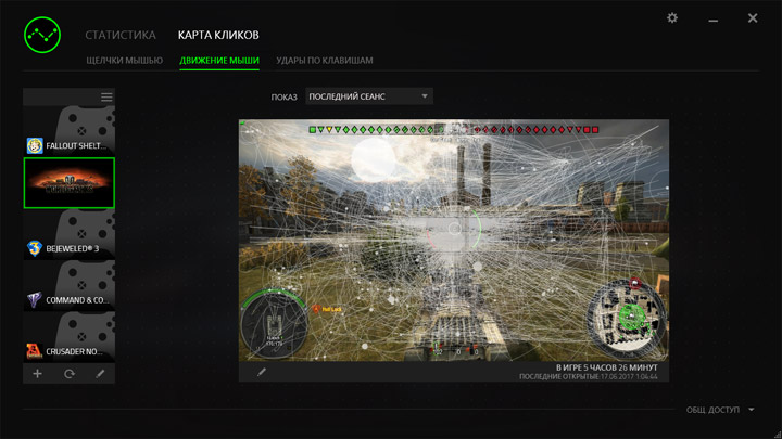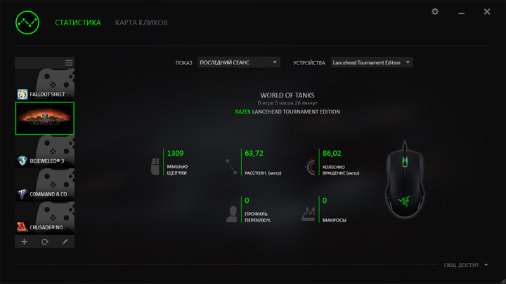Модуль статистики при активации собирает количественные данные про использование мыши. Данные аккумулируются раздельно по всем используемым игровым приложениям и устройствам.