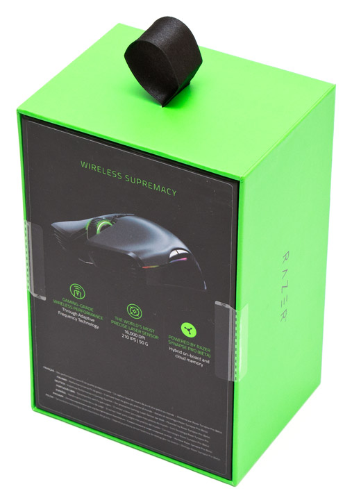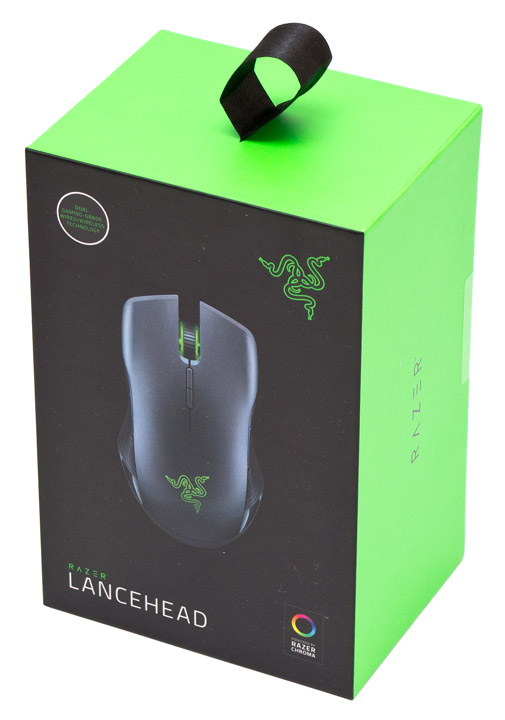 Упаковка мыши получилась чуть более крупной в профиль, чем у Lancehead TE, хотя стилистика в целом осталась без изменений. В качестве трех главных достоинств манипулятора, маркетологи Razer выделили «беспроводную производительность игрового уровня» с технологией адаптивной частоты, «самый точный в мире лазерный сенсор» и поддержку ПО Synapse Pro (или же Synapse 3.0 — они еще сами до конца не определились, как его точно называть) для реализации возможностей встроенной в устройство памяти.