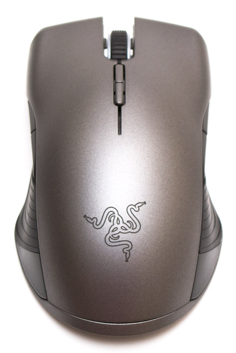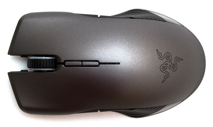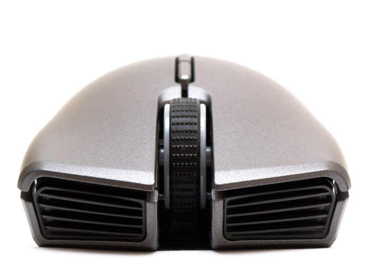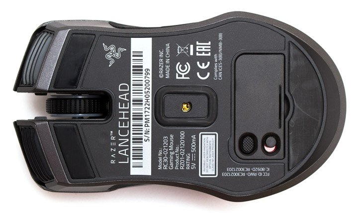 Форма корпуса у Razer Lancehead практически такая же, как и у TE версии — симметричная, со слегка расширенными и закругленными боковинами в кормовой части. Однако есть и ряд отличий. Материал верхней панели представляет собой довольно гладкий пластик, окрашенный в серый цвет (тон «ружейный» металл) с небольшим отливом. Перед колесом прокрутки есть углубление для подключения кабеля, ничем не занятое в беспроводном режиме. Панели двух основных клавиш тонкие и подвижные, легко изгибаются в стороны. Однако свободного хода при нажатиях у них нет, усилие нажатия среднее, тактильная отдача четкая. Клик по громкости ниже среднего. За прорезиненным колесом прокрутки есть две узкие кнопки смены разрешения. Они мягкие и тихие, усилие нажатия небольшое.