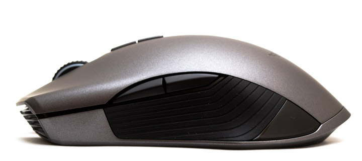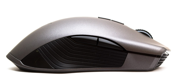 На левой боковине манипулятора есть большая резиновая накладка, благодаря которой мышь цепко сидит в пальцах пользователя. Две дополнительные боковые кнопки расположены в правильном месте, тянуться за ними не приходится. Как и в ТЕ варианте, они сильно утоплены в корпус, нащупать и нажать их может быть сложно. Срабатывают они со средней громкостью и усилием чуть выше среднего, есть небольшой запас свободного хода. В зазоре под клавишами и верхней панелью проходит боковая лента подсветки, состоящая из семи отдельных светодиодов.