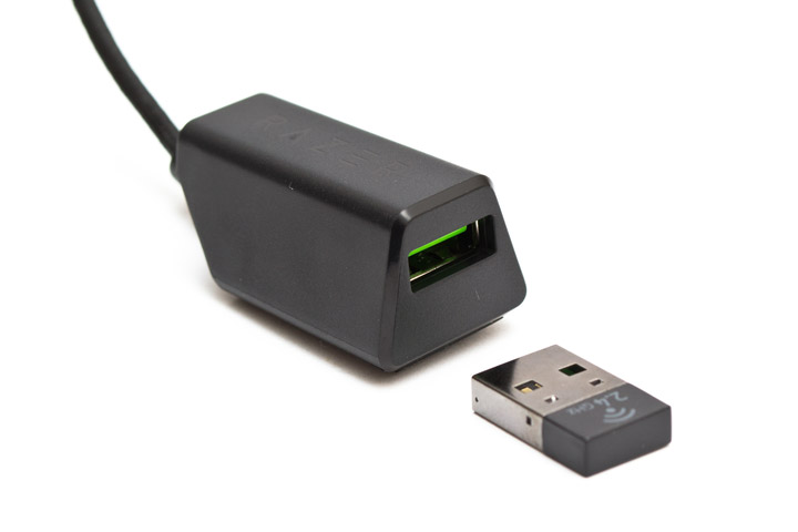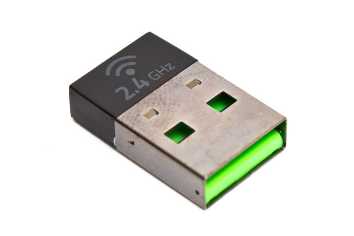 Для связи с компьютером Razer Lancehead использует вполне обычный на вид USB-передатчик миниатюрного размера, работающий в частотном диапазоне 2,4 ГГц. Однако производитель утверждает что все далеко не так просто и в данном устройстве встроена технология адаптивной частоты. Ее суть состоит в том, что частотный диапазон каждую миллисекунду сканируется на предмет наличия помех и связка из мыши и приемника мгновенно переходит на ту частоту и канал, которые являются наиболее стабильными и свободными от помех. Требуется ли для этого программное обеспечение, и куда именно зашит алгоритм работы данной технологии — в приемник, мышь или в ПО, производитель не уточняет.