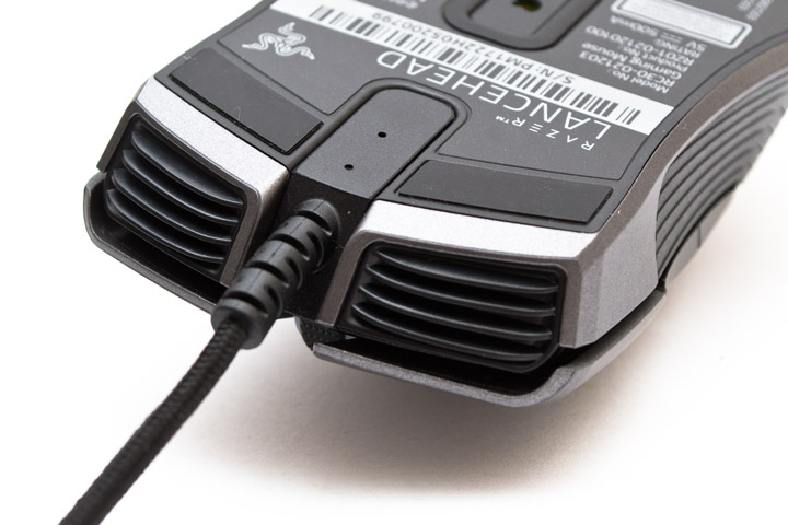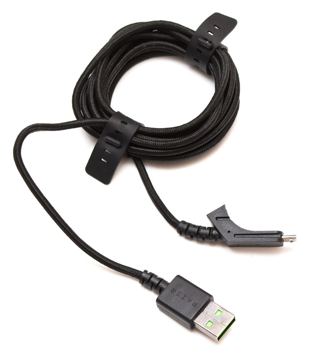 Кроме того, Lancehead умеет не только заряжаться, но и работать через USB-кабель. Комплектный шнур имеет длину 2,2 метра и нестандартную форму разъема для подключения мыши. Он полностью заключен в оплетку и является мягким и достаточно гибким, что позволяет комфортно использовать его без дополнительного держателя. На шнур надето сразу две многоразовые резиновые стяжки, позволяющие регулировать его длину.