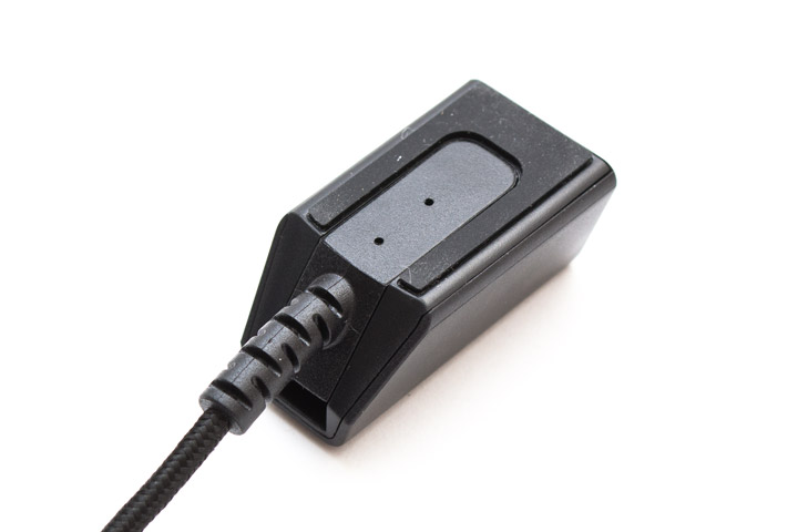 Сигнальный кабель подключается к мыши ровно по центру, на небольшой высоте. Крупная защита от перегиба не позволяет ему тереться об игровую поверхность. Извлекается обратно с заметным усилием. Специального фиксатора для провода не предусмотрено.