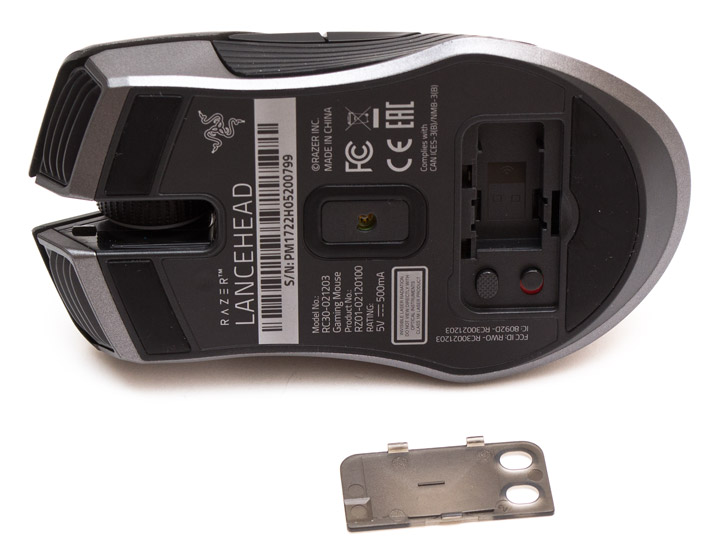 Крышка оказалась полупрозрачной. За ней находится вовсе не батарейный отсек, а место для хранения передатчика. Назвать такое решение элегантным сложно, оно характерно, скорее, для производителей бюджетных устройств, нежели для передовой в сфере дизайна компании, которой себя считает Razer.