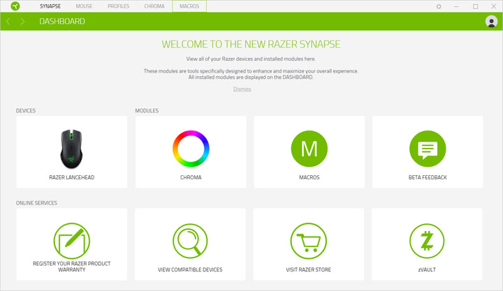 С главного меня драйвера есть прямой доступ к отдельным модулям, среди которых присутствуют настройка мыши, редактор подсветки, редактор макросов, форма обратной связи с разработчиками, регистрация и сверка гарантии продукта, просмотр совместимых устройств, доступ в магазин Razer и даже в собственный кошелек, содержащий «валюту» от Razer. Все модули, которые не являются простыми ссылками, дублируются в привычном перечне меню в верхнем левом углу окна приложения. В правом верхнем углу есть доступ в учетную запись текущего пользователя.