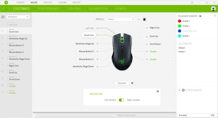На экране настройки кнопок мыши есть возможность переназначить любые команды для всех девяти клавиш и двух направлений прокрутки. Полный перечень доступных команд будет обозначен на вкладке слева. Кроме того можно быстро поменять ЛКМ и ПКМ местами, для использования под правую или левую руку. А справа доступен перечень профилей (отдельная выдвижная вкладка), которые можно записать во внутреннюю память в четыре слота, обозначенных красным, зеленым, синим и голубым цветами. В правом нижнем углу в процентах отмечено доступное место в памяти.