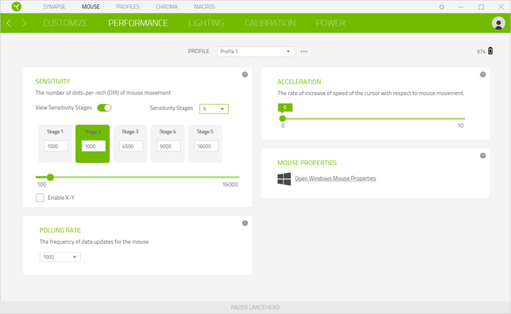 В настройках «эффективности» регулируется разрешение сенсора в пределах от 100 до 16000 dpi с шагом в 100 dpi. Можно настроить пять отдельных уровней чувствительности, либо оставить лишь один уровень. Доступно раздельное или синхронное изменение чувствительности по осям X и Y. Позитивная акселерация курсора выставляется в рамках от 0 до 10 единиц. На выбор дано три частоты опроса — 125, 500 или 1000 Гц. Кроме того, тут есть прямая ссылка на стандартную программу для базовой настройки мыши Windows. Текущий заряд батареи отображается во всех вкладках в верхнем правом углу.