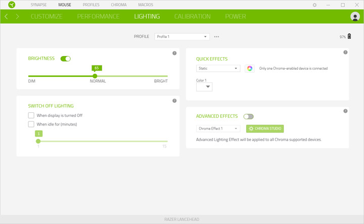 В базовых настройках подсветки есть возможность регулирования световых эффектов одновременно для всех зон по цвету и яркости (в пределах от 33 до 100%). Кроме того, можно настроить время отключения подсветки в случае отключения экрана или при простое мыши в диапазоне от 1 до 15 минут. Для более сложных настроек нужно установить галочку «продвинутые эффекты» и перейти в Chroma-редактор. А еще эффекты можно синхронизировать для других устройств, поддерживающих Chroma-подсветку.