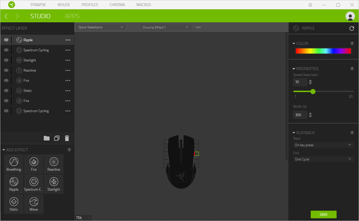 Конфигуратор Chroma Studio позволяет осуществлять очень тонкую раздельную настройку параметров всех зон и эффектов подсветки и устраивать с помощью мыши зрелищные световые шоу. Отсюда же доступны другие приложения, поддерживающие освещение Chroma.