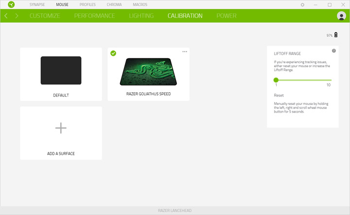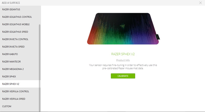Калибровка позволяет настроить высоту отрыва сенсора от поверхности под конкретный тип коврика. Это можно сделать путем выбора фирменного коврика Razer из перечня с готовыми настройками, осуществить автоматическую калибровку под любой новый тип поверхности или задать высоту отрыва вручную.