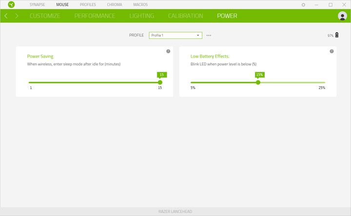 В настройках управления батареей доступно два параметра — время перехода в спящий режим при простое (в интервале от 1 до 15 минут), и триггер, при котором мышь начинает помигивать красным цветом на колесе прокрутки, сообщая, что уровень заряда низкий. Данное предупреждение можно вызвать при достижении уровня в 5, 10, 15, 20 или 25% от полной емкости батареи.