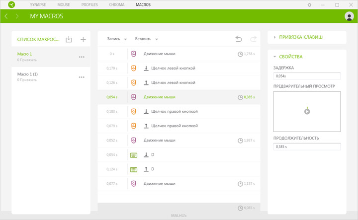 Редактор макросов в новом Synapse 3.0 получил новый функционал и внешний вид, преобразился как формально, так и по сути. В левой вкладке есть полный перечень созданных команд, которые можно копировать, импортировать, экспортировать и удалять. Запись команд происходит в центральном окне, где принимаются не только нажатия на мышь или клавиатуру, но и даже записывается траектория движения курсора, относительно конкретного окна или экрана в целом. В правой вкладке показаны доступные назначения команд, параметры для выставления временных задержек и схематически записанная траектория курсора.