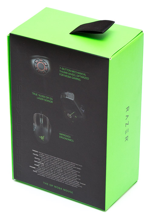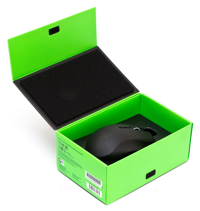 Внешний дизайн упаковки у продуктов Razer всегда был на высоте, и этот раз не стал исключением. Черная коробка с зелеными боковыми гранями сразу выделается на фоне конкурентов. Изображение и название мыши спереди и лаконичное описание достоинств — сзади. Про габариты и информацию о совместимости изделия можно узнать, посмотрев на дно упаковки. Сверху же есть мягкий хлястик для подвески на торговые стенды.