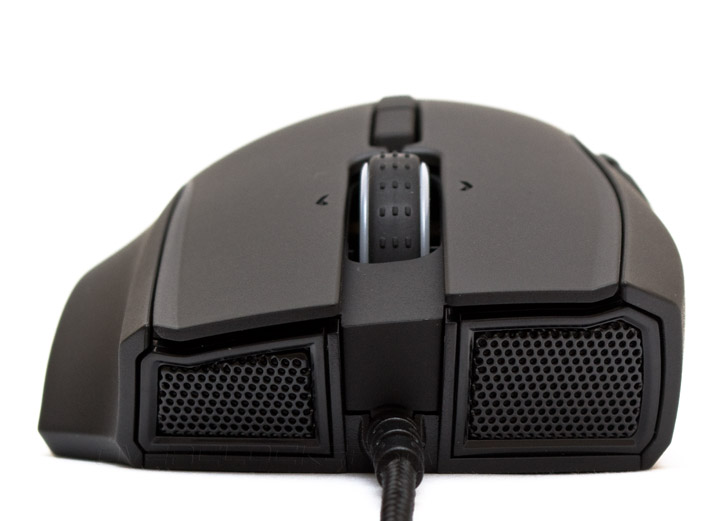 В передней части мыши есть два стильные металлические сеточки (традиционные почти для всех последних продуктов компании), имитирующие воздушные решетки спортивных автомобилей. Сигнальный кабель входит в корпус по центру, в месте контакта есть хорошая защита от перегиба, расположенная достаточно низко по высоте. Подгонка панелей и деталей корпуса выглядит близкой к идеалу. Колесо прокрутки прорезинено и имеет тройные тактильные насечки, нанесенные рядами. Колесо кстати наклоняется в стороны, о чем недвусмысленно напоминают выгравированные на основных кнопках стрелочки. Вращается оно весьма и весьма тихо, даже на высокой скорости. Имеет четко ощутимые позиции фиксации.