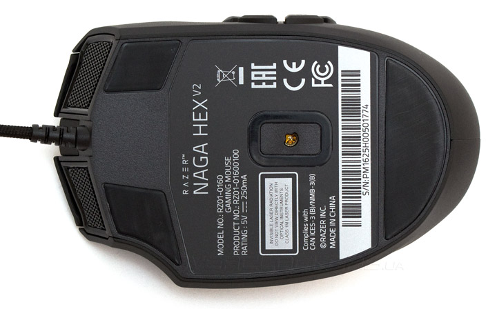 В сравнении с прошлыми моделями, корпус Razer Naga Hex V2 стал более приятным, как с точки зрения эргономики, так и внешнего вида. В качестве основного покрытия здесь применяется шероховатый и цепкий пластик, который практически не собирает отпечатки пальцев и быстро испаряет жидкость. По размерам мышь получилась чуть больше среднего и достаточно комфортно ложится даже в крупную ладонь.