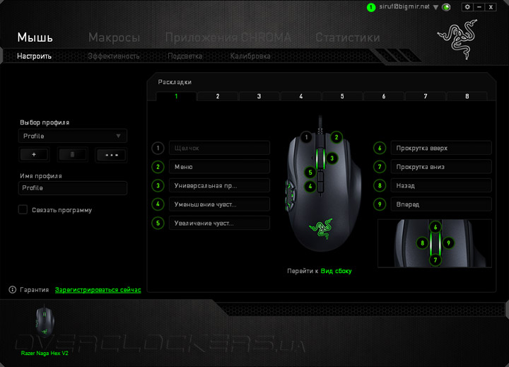 Первый раздел вкладки «Мышь» позволяет переназначать 16 команд на всех кнопках и колесе прокрутки манипулятора. В каждом профиле сохраняется до восьми вариантов назначения кнопок. Активацию любого профиля можно привязать к старту любого необходимого приложения. Вариантов команд есть великое множество, потому перечислять их все не имеет особого смысла. Стоит только упомянуть, что запись и активация сложных макросов тоже поддерживается.