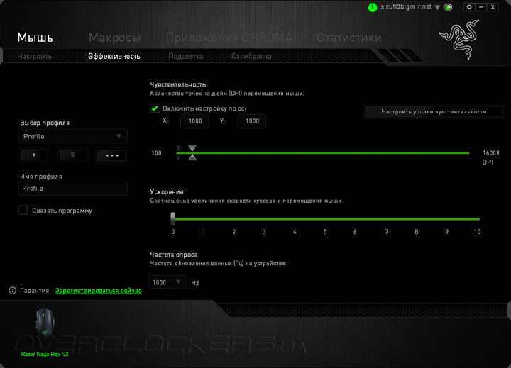 В подразделе «Эффективность» собраны настройки, касающиеся сенсора мыши. Чувствительность датчика регулируется в пределах от 100 до 16000 dpi с шагом в 100 единиц. Оси X и Y можно настраивать как вместе, так и раздельно. Всего в каждом профиле можно выставить до пяти фиксированных уровней чувствительности, чтобы потом было проще переключаться между ними. Здесь же есть ползунок регулировки ускорения курсора (его лучше всегда оставлять в позиции «0») и выбор трех вариантов частоты опроса сенсора — 125, 500 или 1000 Гц.