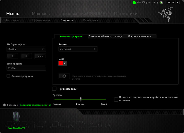 Три зоны RGB-подсветки на мыши — это колесо прокрутки, логотип Razer в задней части верхней панели и зона вокруг центральной резиновой вставки вместе со всеми семью дополнительными клавишами. Весь воспроизводимый спектр цветов выглядит очень живо и сочно. И даже белый цвет действительно похож на белый. И это замечательно.