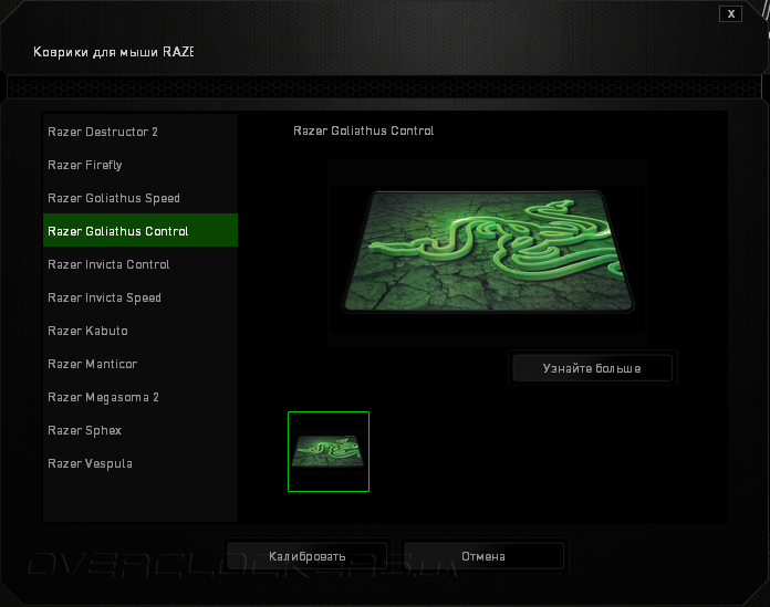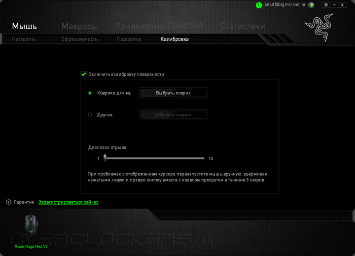 Раздел «Калибровка» отвечает за настройку высоты отрыва сенсора (LOD — lift-off-distance). Если ее включить, то можно выбрать, либо из предустановленных вариантов настройки LOD для фирменных игровых поверхностей, либо настроить свой вариант. После калибровки становится активной и ручная регулировка LOD в диапазоне значений от 1 до 10.