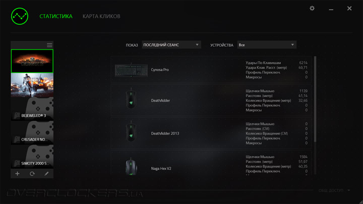 Модуль сбора статистики по использованию устройств Razer тоже запускается из интерфейса драйвера, но является отдельным ПО. Здесь записываются данные по работе всех устройств, когда-либо подключенных конкретным пользователем.