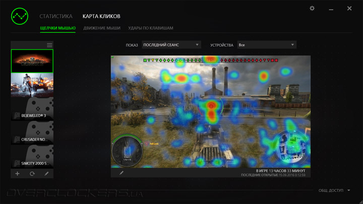 Тепловая карта отображает визуально точки, в которых наиболее часто производятся нажатия мыши в каждой отдельной игре.