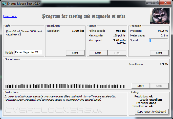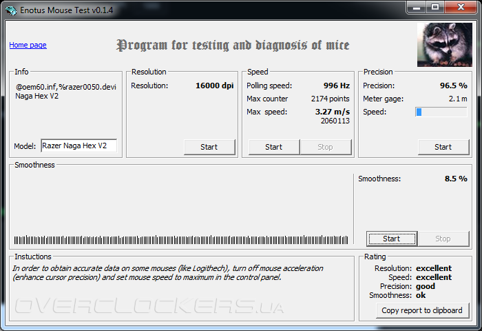Поведение сенсора Philips PLN2037 Twin Eye в данной модели мыши я бы назвал слегка странным и неоднозначным. Первое, что бросилось в глаза при изначальной настройке драйверов — это управление высотой отрыва. Даже выставив ее в «0» на родном ковре, от курсора не удалось добиться мгновенного замирания при подъеме мыши. Он все равно ощутимо смещается, причем если на низких разрешениях это не особо мешает, то на высоких — прыжок курсора весьма заметен при отрыве. Кроме того, иногда мышь «забывает» настройки LOD и начинает использовать средние «по умолчанию». Переубедить ее изменением настроек в драйвере не удается и остается произвести сброс вручную, путем зажимания левой, правой и средней кнопок мыши на пять секунд. Далее, хотя сглаживание траектории и точность позиционирования курсора находится на приемлемом уровне, у данного сенсора явно ощущается сильная и непредсказуемая акселерация, как негативная, так и позитивная. И наконец — самое главное, предельная скорость и ускорение. С этим проблем еще больше. По паспорту Naga Hex V2 должна выдерживать ускорение в 50g и максимальную скорость в 5,34 м/с. По факту, срывы курсора стабильно происходят уже после 3 м/с. Причем срыв курсора приводит, обычно, не просто к замиранию, а к полной дезориентации сенсора, после которого он начинает жить своей жизнью и двигаться по осям в произвольном направлении вплоть до повторного подключения мыши к порту. Характер данного явления не зависит от текущего разрешения и проявляется как на «верхах», так и на «низах». Хотя и данной скорости будет достаточно в большинстве игр, любителям динамичных FPS-баталий Naga Hex V2 может не подойти. И в довершение всего — данный сенсор очень боится пыли, накопление которой быстро приводит к его нестабильной работе. Лечится это продувкой окошка сенсора струей воздуха.