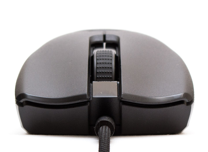 Колесо прокрутки мыши покрыто мелкими тактильными насечками. Вращается тихо, все позиции фиксации хорошо различимы тактильно и отрабатываются механизмом четко. Люфта колесо не имеет, нажимается достаточно легко. Сигнальный кабель заходит в корпус по центру внизу. В месте входа есть приличная защита от перегиба длиной в 18 мм.