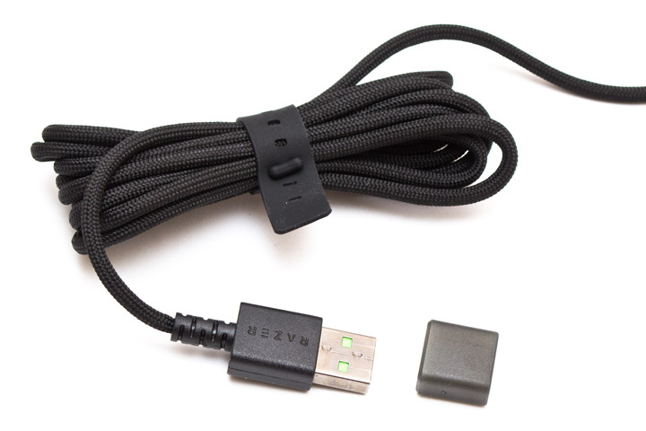 USB-шнур здесь на редкость удачный. Можно даже сказать лучший из тех, что мне доводилось видеть на игровых мышах. Его маркетинговое название — Razer Speedflex. Он очень мягкий и податливый, несмотря на оплетку. Мышь можно вполне использовать без держателя кабеля. И она будет ощущаться как беспроводная. Длина провода составляет 2,15 метра. Разъем USB укороченный, с зеленым пластиком в районе контактной площадки. Еще есть резиновая многоразовая стяжка, позволяющая отрегулировать длину провода на свой вкус, и колпачок для защиты разъема от пыли.