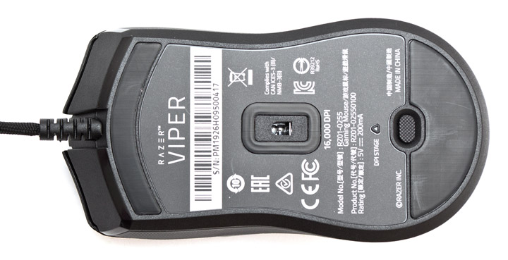 На основании мыши есть две полукруглые тефлоновые ножки спереди и сзади. Третья овальная ножка окружает собой датчик по центру. В роли сенсора здесь используется самая современная оптика PixArt PAW3390. Посередине задней ножки расположена клавиша переключения разрешения, а над ней — цветной треугольный индикатор. Индикатор может отображать красный, зеленый, синий, голубой и желтый цвет, что по умолчанию будет соответствовать разрешению в 400, 800, 1800, 2400 и 3200 dpi.