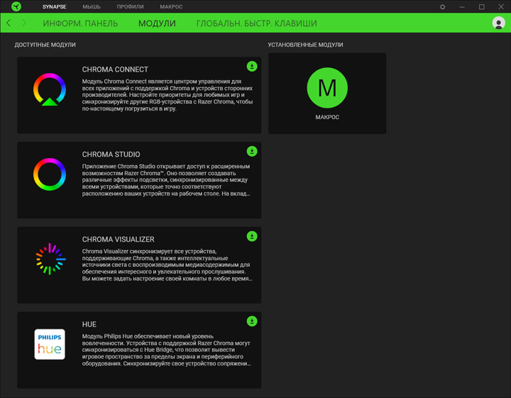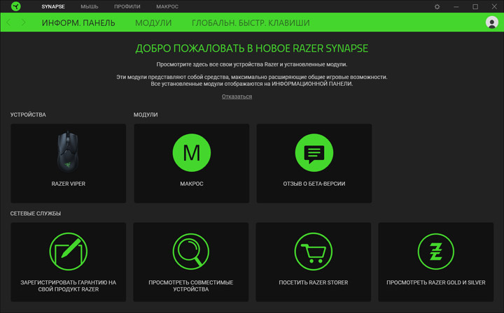 Стартовый экран Synapse 3 имеет «модульную» структуру расположения программ. В новой версии программы появилась возможность отказаться от загрузки лишних модулей, например студии визуальных эффектов Chroma или редактора макросов. Форма обратной связи с разработчиками, гарантийная форма, информация о поддерживаемых устройствах, ссылка на магазин Razer, и ссылка на фирменную валютную систему Razer Gold & Silver остались на своем месте. Все модули, которые не являются простыми ссылками, дублируются в привычном перечне меню в верхнем левом углу окна приложения. В правом верхнем углу есть доступ в учетную запись текущего пользователя.