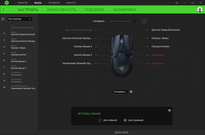 На экране настройки кнопок мыши есть возможность переназначить любые команды для восьми основных клавиш и двух направлений прокрутки. Полный перечень доступных команд обозначен на выпадающей вкладке слева. Кроме того, можно назначить дополнительные функции для режима Hypershift, в котором при зажатии определенной клавиши и активации режима, функции всех кнопок меняются на альтернативный набор команд. Вкладка выбора и привязки профиля находится сверху по центру. Внизу по центру есть переключатель раскладки ЛКМ под правшей или левшей. Мышь не обладает встроенной памятью и во всем полагается на драйвер.