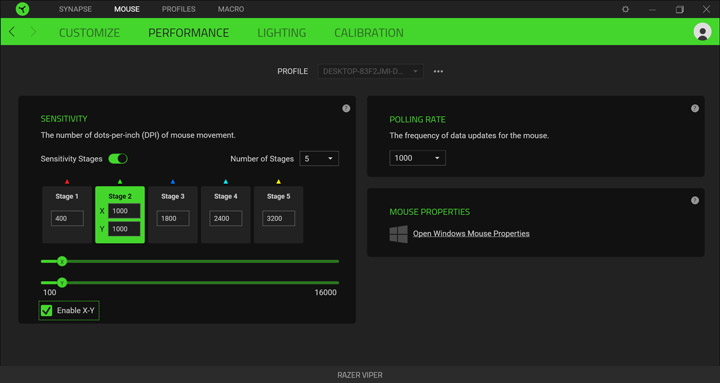 В настройках «эффективности» регулируется разрешение сенсора в пределах от 100 до 16000 cpi с шагом в 50 единиц. Возможна и раздельная настройка горизонтальной и вертикальной оси. Можно настроить пять отдельных уровней чувствительности, либо оставить лишь один уровень (отключив соответствующий ползунок). На выбор есть три частоты опроса в 125, 500 или 1000 Гц. Есть тут и прямая ссылка на стандартную программу для базовой настройки мыши Windows.