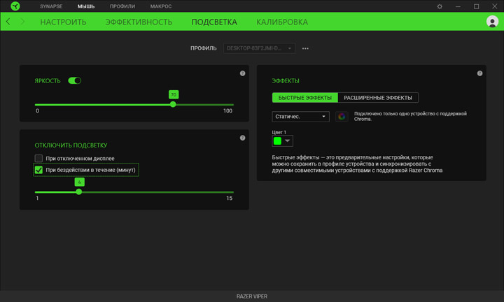 В базовых настройках подсветки мыши есть возможность регулировки яркости (в пределах от 0 до 100%). Есть ползунок, позволяющий отключить подсветку полностью. Можно настроить время отключения подсветки в случае отключения экрана или при простое мыши в диапазоне от 1 до 15 минут. В быстрых эффектах можно выбрать реактивную, пульсирующую, статическую подсветку, циклическую смену цветов либо режим аудио-визуализации, когда мышь будет подмигивать в такт звуку. Цвет и настройки эффектов выбираются отдельно, с разными опциями в зависимости от текущего режима. Эффекты можно синхронизировать для других устройств, поддерживающих Chroma-подсветку. Для более сложных настроек нужно установить галочку «расширенные эффекты» и перейти в редактор Chroma Studio.