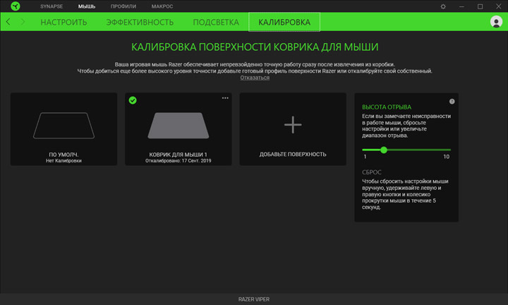 Есть и раздел калибровки высоты отрыва сенсора от поверхности. Базовая настройка по умолчанию не предусматривает возможности калибровки. Но если выбрать фирменный коврика Razer из перечня (или вариант Custom), то появляется опция ручной настройки высоты отрыва в пределах от 1 до 10 единиц, что соответствует диапазону от 1 до 3 мм.