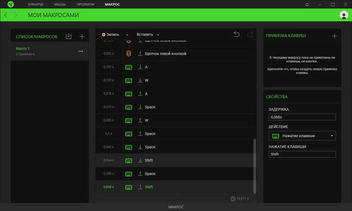 Продвинутый и удобный макроредактор позволяет записывать все команды с мыши и клавиатуры, в том числе направления колеса прокрутки. Можно включить и регистрацию траектории движения курсора. Задержки записываются как есть или на определенные предустановленные значения. Все макросы можно переименовывать, удалять, импортировать, экспортировать и копировать. Здесь же их можно напрямую привязать к нужной клавише, задав параметры и условия воспроизведения.