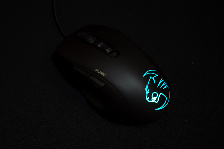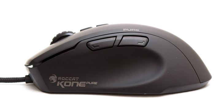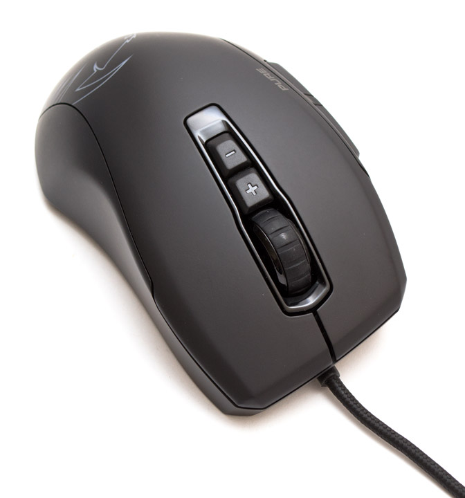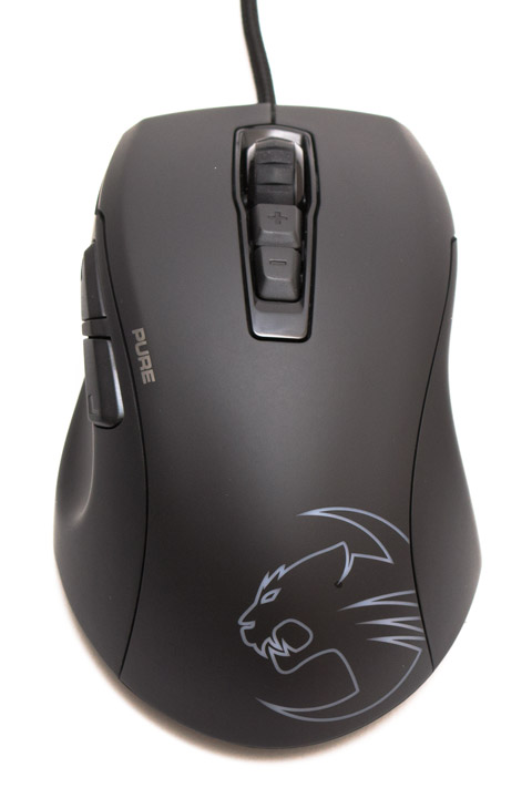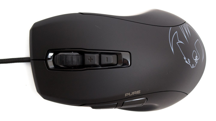 Форма корпуса у Roccat Kone Pure асимметричная, рассчитанная под правую руку, с ярко выраженными изгибами для хвата пальцами сбоку. Покрытие всего корпуса представляет собой гладкий на ощупь, но, одновременно, очень цепкий пластик, который у Roccat называется Pro-Grip. Он устойчив к царапинам и рука на нем практически не потеет. Единственным его недостатком является скорость, с которой он собирает на себе грязь и отпечатки пальцев. Окантовка колеса прокрутки выполнена из глянцевой пластмассы. Две клавиши за ним, с символами «+» и «–» служат для изменения уровня разрешения. Срабатывают от среднего усилия и звучат негромко. Левая и правая клавиша нажимаются со средним усилием без свободного хода, и щелкают чуть громче обычного. Переключатели под ними имеют ресурс наработки на отказ в 50 млн. нажатий. Подгонка сплошных панелей кнопок отличная, они не люфтят ни в каком направлении.