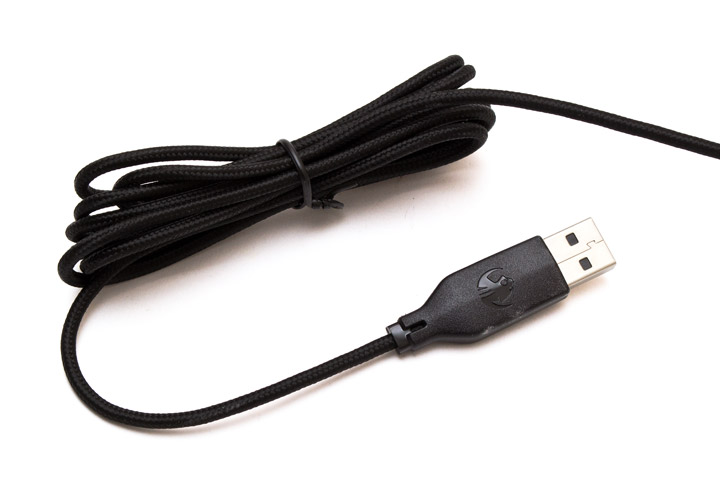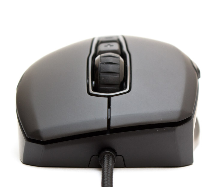 Панели основных кнопок, если смотреть спереди, наклонены в сторону, зазоры между ними и корпусом минимальны. «Титановое» колесо прокрутки обрезиненное по ободу, крутится с одинаковым хрустом по направлению вверх и вниз и имеет четко различимые на слух и тактильно позиции фиксации. Средняя клавиша под ним является средней и по силе нажатия и по громкости щелчка, ее сопротивление подобрано правильно. Кабель входит в корпус мыши посередине, защита от перегиба у него маленькая и твердая.