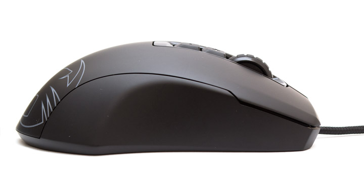 Левая сторона мыши сделана из того же пластика, что и верхняя панель. Самое примечательное тут — это рельефная выемка под большой палец. Две боковые кнопки подняты практически на верхнюю грань, что исключает случайные нажатия на них. Запаса свободного хода они не имеют, усилие, необходимое для активации и громкость срабатывания у них среднее.
